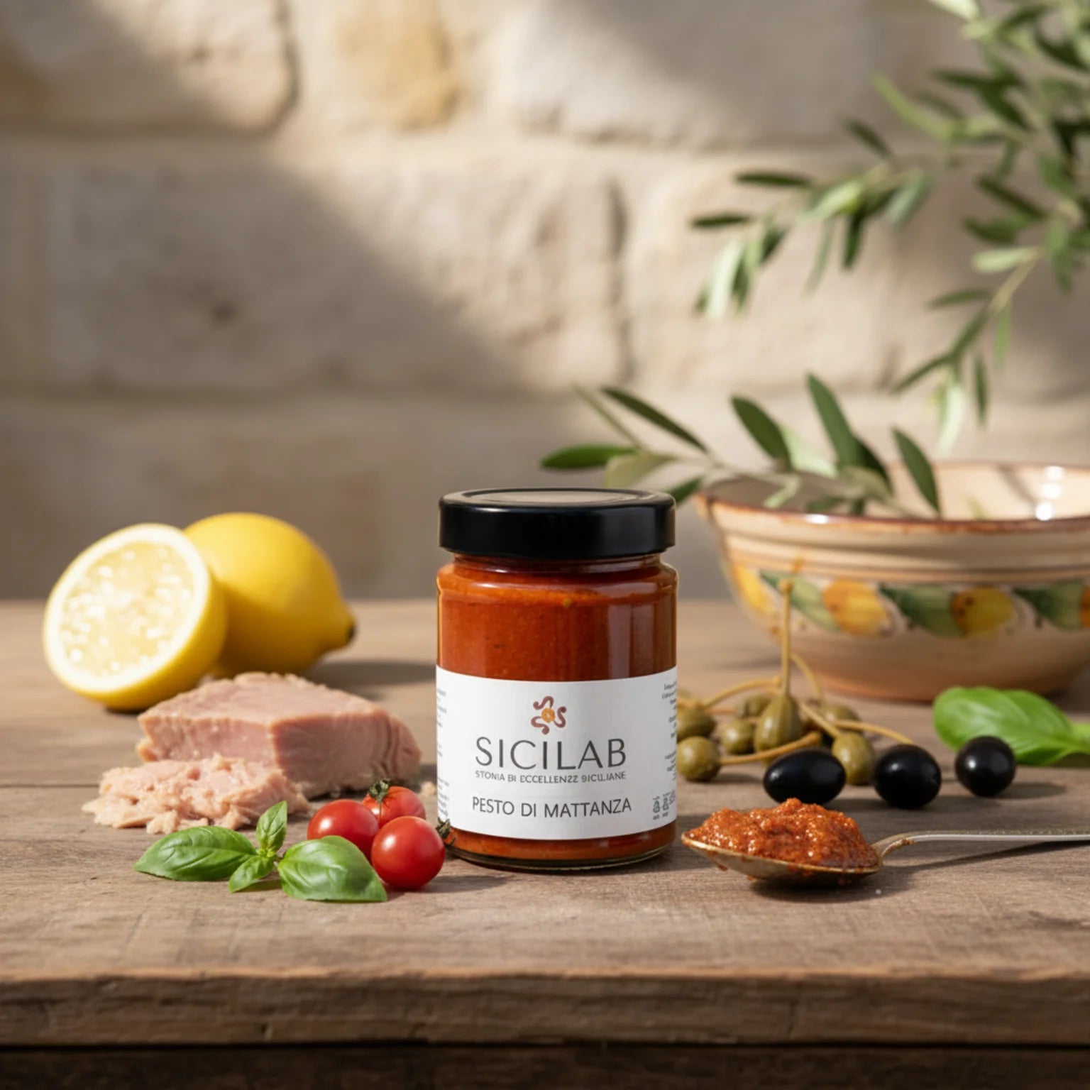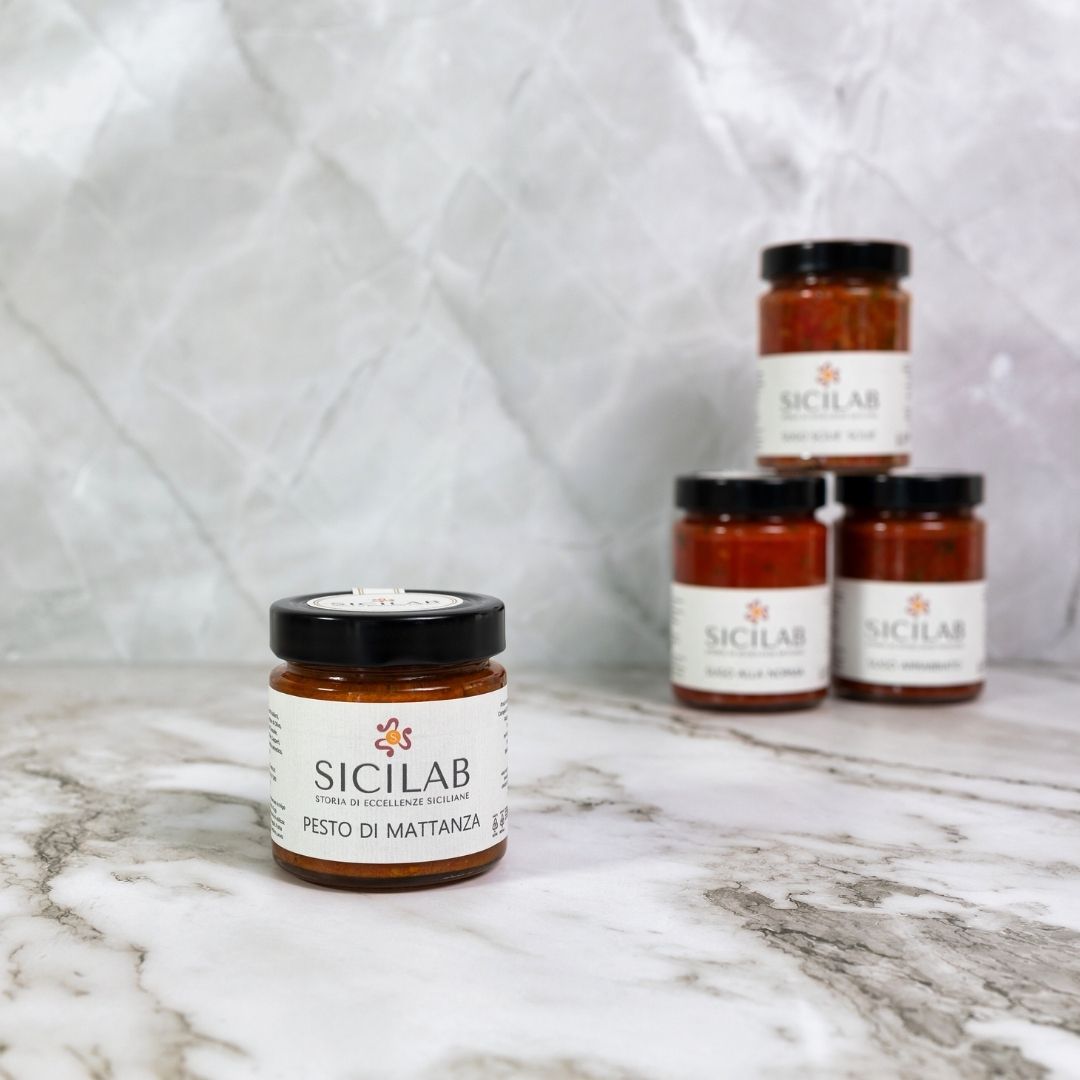 Il nome evoca antiche tradizioni e riti del popolo siciliano, legati alla pesca del tonno. Il Pesto di Mattanza è un condimento unico che combina pezzi di tonno sott'olio, capperi, olive e un tocco di limone. La ricchezza del tonno, con la sua texture carnosa e saporita, è esaltata dalla freschezza degli altri ingredienti, creando un equilibrio perfetto tra terra e mare. Questo pesto non è solo un condimento, ma una storia, un racconto di uomini e mare, di sfide e tradizioni, che vengono rivissute ad ogni assaggio.